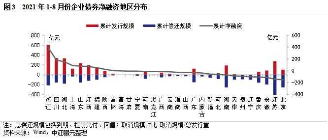 從地區(qū)分布看,2021年1-8月份企業(yè)債凈融資依然呈現(xiàn)兩極分化,多個經(jīng)濟(jì)欠發(fā)達(dá)地區(qū)本年度尚未發(fā)行企業(yè)債。其中,浙江省實現(xiàn)凈融資392.52億元,遠(yuǎn)高于其他省份,其次是四川省和湖北省分別實現(xiàn)凈融資181.62億元和153.20億元,位居第二、第三。此外,上海因償還規(guī)模較小,實現(xiàn)凈融資規(guī)模88.15億元,位居第四。而湖南省、江蘇省和廣東省因償還規(guī)模較大,凈融資規(guī)模為負(fù)。青海、甘肅、黑龍江、海南、內(nèi)蒙古、山西、貴州、遼寧未發(fā)行企業(yè)債,其中,貴州和遼寧的償還規(guī)模較大,分別為92.48億元、101.94億元。