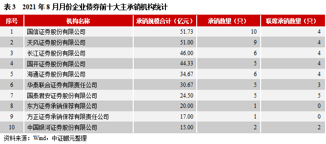 就承銷機(jī)構(gòu)而言,2021年8月共有29家機(jī)構(gòu)參與企業(yè)債券的承銷工作。國信證券和天風(fēng)證券分別承銷51.73億元和51億元,位居第一、第二;長江證券承銷46億元,位居第三;國開證券承銷44.33億元,位居第四。