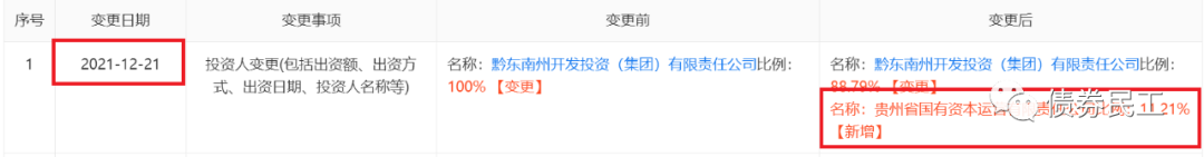3、2021年12月21日,貴州國(guó)資公司成為黔東南州交通旅游建設(shè)投資(集團(tuán))有限責(zé)任公司(中誠(chéng)信國(guó)際和中證鵬元主體信用等級(jí)AA,實(shí)際控制人黔東南州國(guó)資委)持股比例為11.21%的股東。