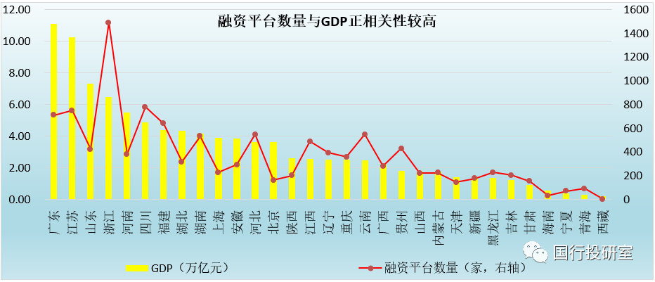 2、數據上顯示,融資平臺數量分布與地區(qū)GDP之間有較高的相關性,如融資平臺主要分布在浙江、四川、江蘇、廣東、福建、河北、云南、湖南、江西、貴州、山東、遼寧等12個地區(qū)的融資平臺數量占比達到70%左右。這主要是因為穩(wěn)增長的背景下,承擔著各地基建主要任務的融資平臺具有存在的必要性,特別是地方政府債券額度較為有限的低經濟總量地區(qū)。