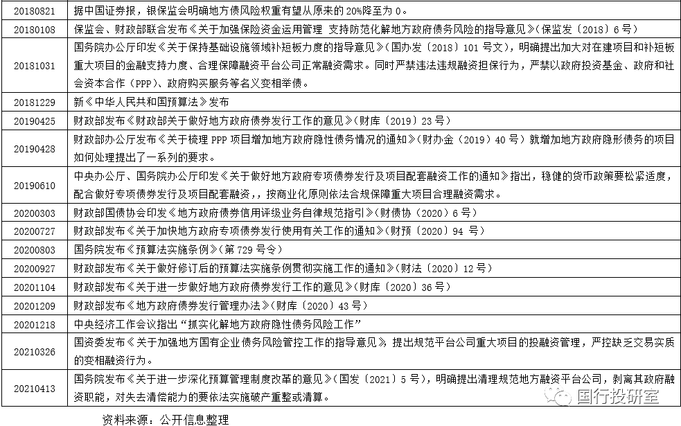 4、2018年8月,國務院發(fā)布《關于防范化解地方政府隱性債務風險的意見》(中發(fā)〔2018〕27號),要求地方政府通過“統(tǒng)籌資金、償還一批;債務置換、展期一批;項目運營、消化一批;引入資本、轉換一批”等方式在5-10年內化解地方政府隱性債務。