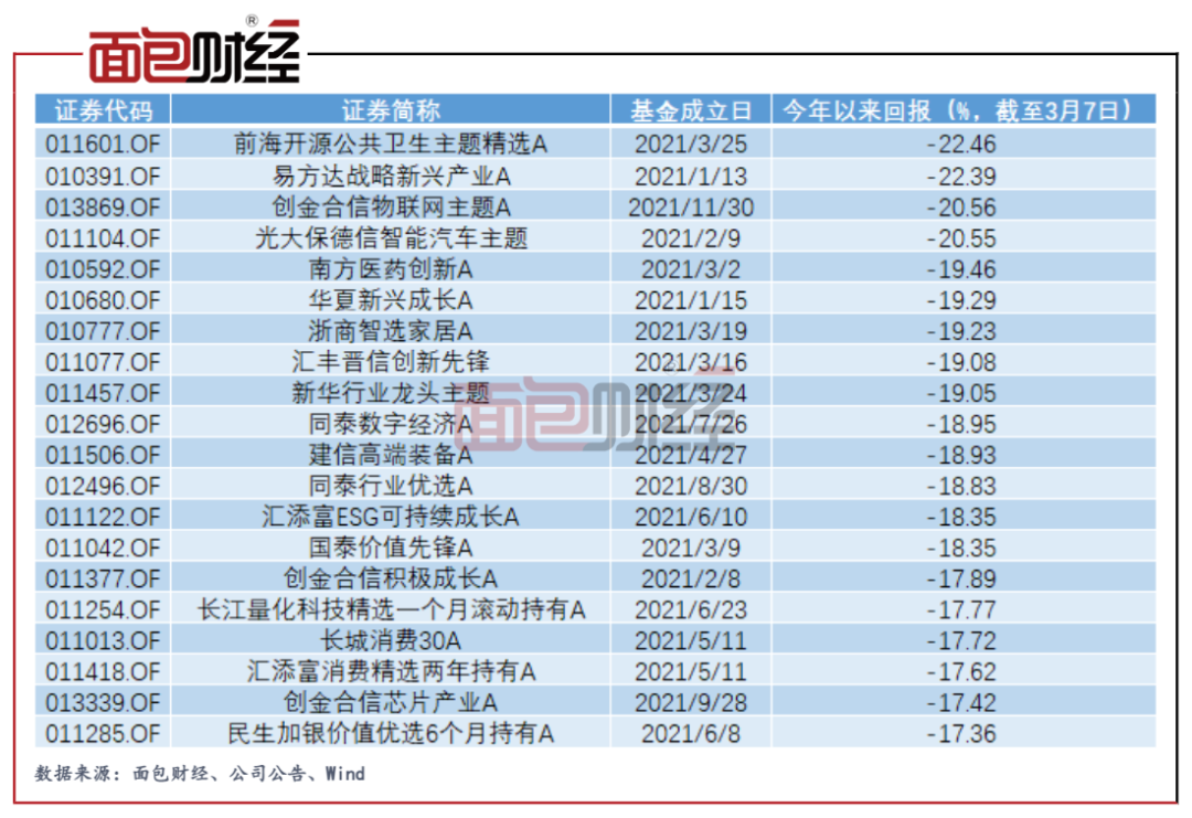 圖1:2021年新成立普通股票型基金今年以來回報排名倒數前20