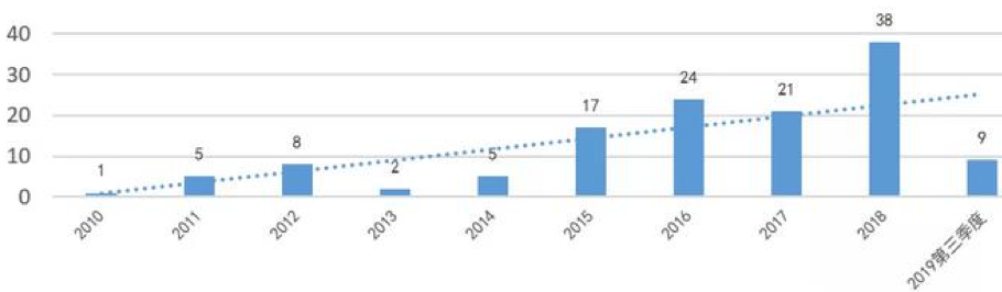 2010年至2019年第三季度,證監(jiān)會及其派出機構總計對130件操縱市場案件作出行政處罰,占十年間證監(jiān)會行政處罰案件總數(shù)的近十分之一。證監(jiān)會處罰的操縱市場案件的數(shù)量僅次于內幕交易、虛假信息披露案件,是監(jiān)管部門重點關注的三大資本市場違規(guī)行為之一。2015年以后,證監(jiān)會對操縱市場案件的查處力度明顯加強,2015年至2019年第三季度,證監(jiān)會總計對109件操縱市場案件作出行政處罰,平均每年處罰操縱市場案件約21件,是2015年以前操縱案件年平均處罰數(shù)量的5倍,其中2018年處罰的操縱市場案件數(shù)量最多,達到38件。具體如下圖所示: