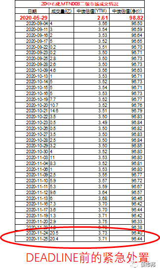 其實(shí)在5月底的時(shí)點(diǎn),市場(chǎng)指標(biāo)給出了明確的利率上行信號(hào)。但是主承并沒有選擇早點(diǎn)割肉,減少損失,而是一路硬扛到了9月4號(hào)才開始第一筆的處置,而持倉的大頭的處置還是在11月24號(hào)和25號(hào)兩天完成的。為什么前面處置都是細(xì)雨綿綿,這兩天確是如此之猛烈呢?回頭看看MTN03的發(fā)行時(shí)間就知道了,5月29號(hào),11月25號(hào)差不多是接近銀保監(jiān)會(huì)要求的6個(gè)月處置極限了,即使虧損,也必須賣了。