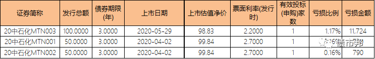 包銷的債券,99%的情況都是票面利率低于市場(chǎng)估值的,也就說包銷券上市時(shí)的凈價(jià)是低于100元面值的,以20中石化MTN003為例,其上市首日凈價(jià)為98.83元,與100元面值中間差的1.17元,便是包銷券的首日浮虧。