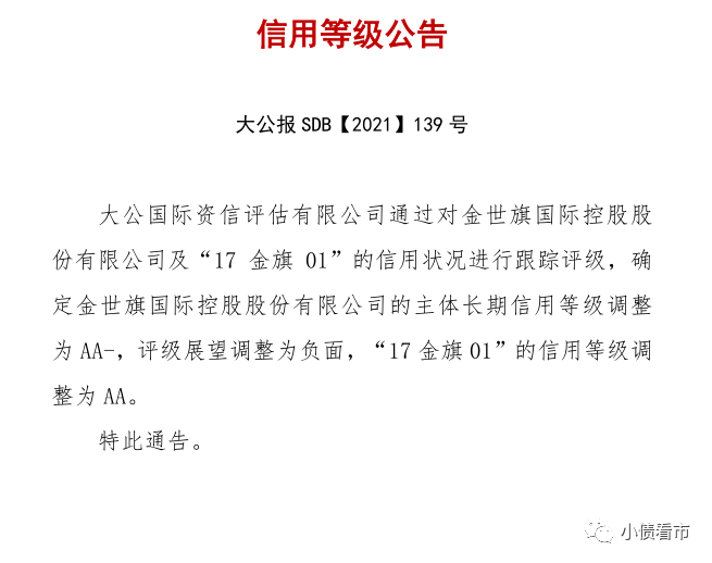 8月31日,大公國(guó)際將金世旗國(guó)際控股股份有限公司(以下簡(jiǎn)稱“金世旗控股”)的主體長(zhǎng)期債務(wù)評(píng)級(jí)從AA下調(diào)至AA-,評(píng)級(jí)展望調(diào)整為負(fù)面,“17金旗01”信用等級(jí)調(diào)整為AA。
