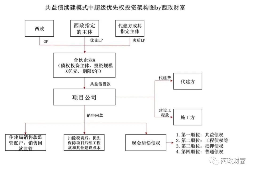1.投資架構:西政(GP)與其指定的主體(優先級LP)及代建方或其指定的主體(劣后級LP)共同成立合伙企業A作為超級優先權投資主體,優先級LP和劣后級LP按7:3的比例出資,總出資額度不超過約定金額。