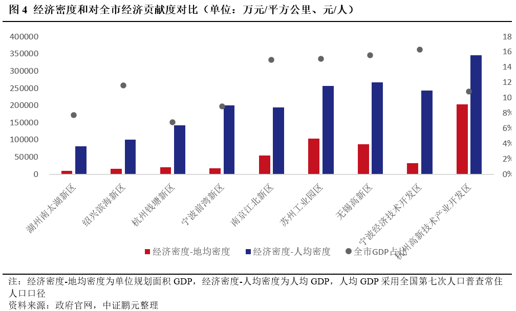 經濟密度方面,四大新區整體開發強度有待提升,且對全市經濟貢獻度普遍較低