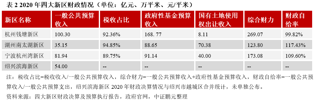 財政實力方面,杭州錢塘新區與寧波前灣新區財政收入規模較高,湖州南太湖新區土地財政依賴度較高;四大新區一般公共預算收入質量整體較高,且收支平衡性較強