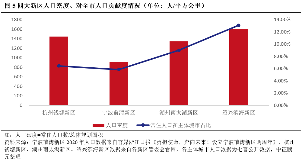 受區位因素影響,紹興濱海新區與湖州南太湖新區人口吸附力較強,寧波前灣新區人口密度與吸附力均較弱