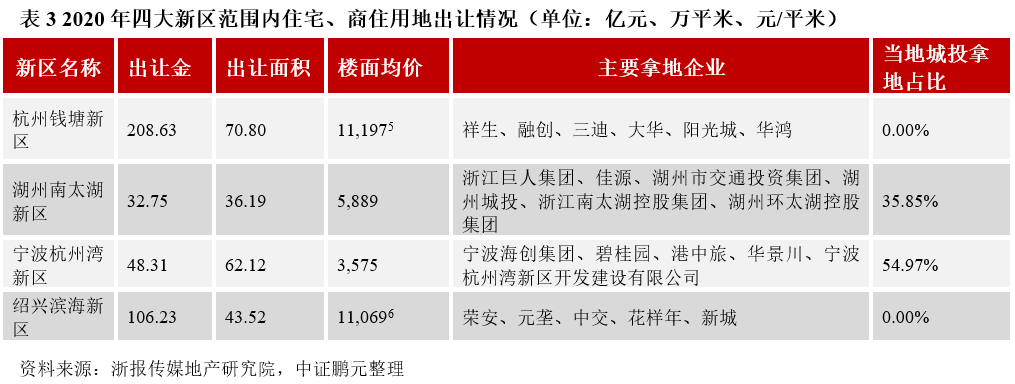 四大新區中寧波前灣新區總規劃面積最大,開發空間較大,而杭州錢塘新區、紹興濱海新區土地出讓收入規模與樓面均價優勢明顯,土地價值更高