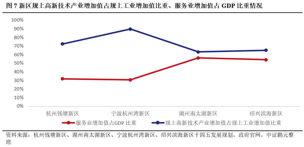 從可獲得數據來看,杭州錢塘新區2020年三產占比為1.3:66.8:31.9,寧波前灣新區2019年三產占比6.9:57.6:35.5,二產占比高于杭州市(2020年為25.9)、寧波市(2020年為45.9)與對標平臺(蘇州工業園區2020年為48.4)。從服務業增加值占GDP比重來看,湖州南太湖新區與紹興濱海新區占比較高,服務業發展水平較好,而杭州錢塘新區與寧波杭州灣新區分別為31.90%、30.80%,低于對標平臺(蘇州工業園區2020年為51.60%),現代服務業發展相對滯后,產業結構調整有較大空間。從規上高新技術產業增加值占規上工業增加值比重看,杭州錢塘新區與寧波杭州灣新區高新技術產業占比較高,分別為72.54%和89.90%,工業基礎較好。