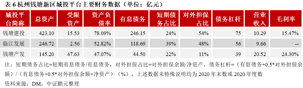 錢塘建投前身為杭州大江東投資開發有限公司,主要從事錢塘新區內的基礎設施項目以及安置房的投資建設,公司整體資產規模與負債水平均較高,2020年末有息債務規模達246.15億元,整體債務負擔較重。臨江發展主要負責臨江高新區的基礎設施建設和投融資業務,同時負責蕭山臨江科創園、杭州灣出海碼頭的日常經營,收入主要來源于園區委托的基礎設施項目代建,2020年末有息債務規模為118.69億元,其中短期債務占比為39%,短期償債壓力較大。錢塘產發是杭州經濟技術開發區的主要城投平臺,從事所屬區域內的工程施工、產業園區及商業服務、配套房地產等業務,園區的物業租售是錢塘產發主要收入和利潤來源,受當地房地產租售市場行情影響較大;公司資產結構以房產、存貨等為主,其中受限資產占比較高,整體資產流動性較弱,2020年末有息債務規模為44.50億元,債務杠桿水平不高。