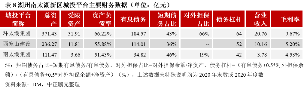 環太湖集團主要從事湖州經濟技術開發區內的土地開發整理和基礎設施、保障房建設業務,收入主要來自貿易、土地開發整理、委托代建,其中貿易業務為2020年新增業務;公司近年有息債務規模快速增長,整體債務負擔較重,且短期債務占比較高。西塞山建設業務范圍主要集中在南太湖新區內西塞山分區、楊家埠分區北片、康山分區及塘口片區,收入主要來自貿易和基礎設施代建業務,代建業務在分區內具有一定壟斷優勢;公司資產結構以其他應收款和存貨為主,基礎設施代建與土地整理等政府回購項目資金到位較緩慢。南太湖集團主要承擔湖州太湖旅游度假區景區設施的開發建設和后期的運營管理任務,收入主要來自銅制品商品銷售、旅游基礎設施代建和旅游服務,其中銅制品銷售收入占比較高,毛利率水平較低為0.24%,旅游服務2020年受疫情影響較大,公司整體盈利能力不佳。