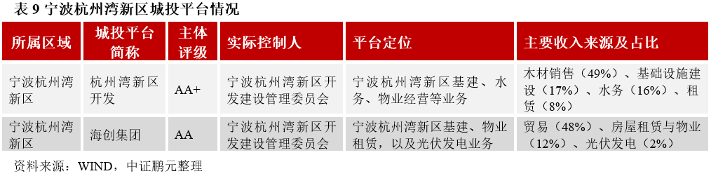 寧波杭州灣新區主要擁有兩個發債城投平臺,分別為寧波杭州灣新區開發建設有限公司(以下簡稱“杭州灣新區開發”)、寧波海創集團有限公司(以下簡稱“海創集團”),其中杭州灣新區開發為主體評級AA+平臺,海創集團為主體評級AA平臺。