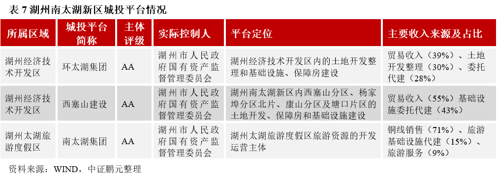 湖州南太湖新區主要擁有三個發債城投平臺,分別為浙江湖州環太湖集團有限公司(以下簡稱“環太湖集團”)、湖州西塞山開發建設有限公司(以下簡稱“西塞山建設”)和浙江南太湖控股集團有限公司有限公司(以下簡稱“南太湖集團”),均為主體評級AA平臺。