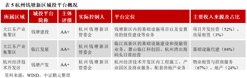 杭州錢塘新區主要擁有三個發債城投平臺,分別為杭州錢塘新區建設投資集團有限公司(以下簡稱“錢塘建投”)、杭州臨江投資發展有限公司(以下簡稱“臨江投資”)和杭州錢塘新區產業發展集團有限公司(以下簡稱“錢塘產發”),均為主體評級AA+平臺。