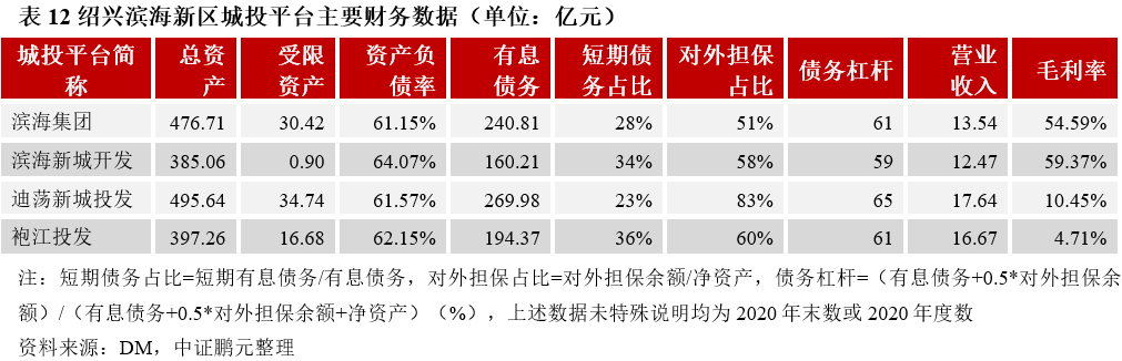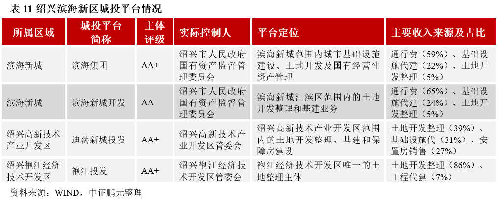 紹興濱海新區主要擁有四個發債城投平臺,分別為紹興濱海新區發展集團有限公司(以下簡稱“濱海集團”)、浙江濱海新區開發投資有限公司(以下簡稱“濱海新城開發”)、紹興高新技術產業開發區迪蕩新城投資發展有限公司(以下簡稱“迪蕩新城投發”)和紹興袍江工業區投資開發有限公司(以下簡稱“袍江投發”),其中濱海集團、迪蕩新城投發和袍江投發均為主體評級AA+平臺,濱海新城開發為主體評級AA平臺。