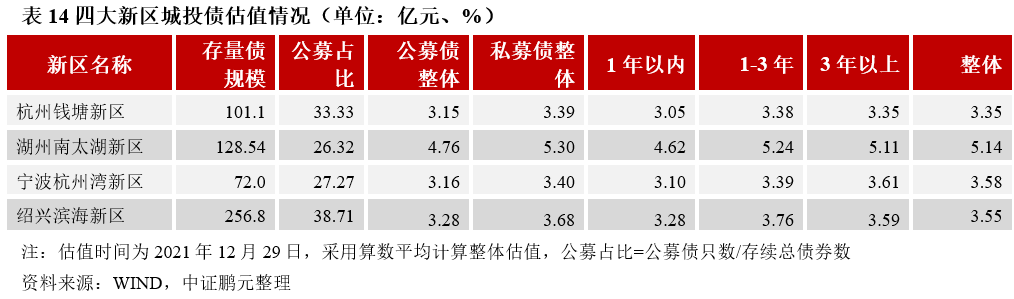 截至2021年12月29日,四大新區城投平臺存續債務余額合計為556.44億元,其中紹興濱海新區存量債規模最高為256.8億元,寧波杭州灣新區(72.0億元)與杭州錢塘新區(101.1億元)規模較小。四大新區合計共有73只存續城投債,其中公募債24只。估值方面,湖州南太湖新區是四大新區中唯一整體估值水平超過5%的區域;杭州錢塘新區、寧波杭州灣新區和紹興濱海新區平臺估值水平在3.5%左右,分別為3.35%、3.58%和3.55%。