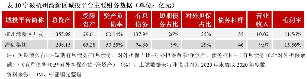 杭州灣新區開發為寧波杭州灣新區最主要發債平臺,主要從事所屬區域內的基建、水務、物業經營等業務,收入主要來自木材貿易、基礎設施建設、供水和物業租賃板塊,基礎設施建設業務主要包括代建、政府購買服務以及 PPP 三種業務模式,業務委托方主要為寧波杭州灣新區開發建設管理委員會,目前公司盈利主要來自基礎設施代建與租賃業務,貿易業務毛利率水平較低,供水板塊仍為虧損狀態,業務運營主要依賴政府補貼;2020年末公司有息債務規模達137.94 億元,整體負債水平偏高。海創集團主要從事寧波杭州灣新區內基建、物業租賃以及光伏發電業務,2020年公司新增貿易板塊收入4.78億元,整體收入規模增長較快,公司盈利仍主要來自旗下物業租賃業務;公司資產中受限資產占比較高,資產流動性較弱,2020年末有息債務規模為74.36億元,短期債務占比不高。