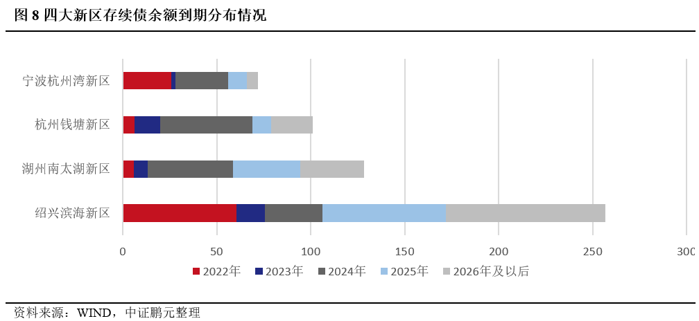 從城投平臺存量債到期時間分布看,2022-2025年和2026年及以后到期存續債占比分別為17.74%、6.89%、27.12%、21.84%和26.42%,整體分布較為均勻。其中,湖州南太湖新區與杭州錢塘新區2022年到期債券規模與占比均較小,到期時間段主要集中在2023年及以后年度;寧波杭州灣新區和紹興濱海新區2020年到期債券規模較大,面臨一定的短期償付壓力。