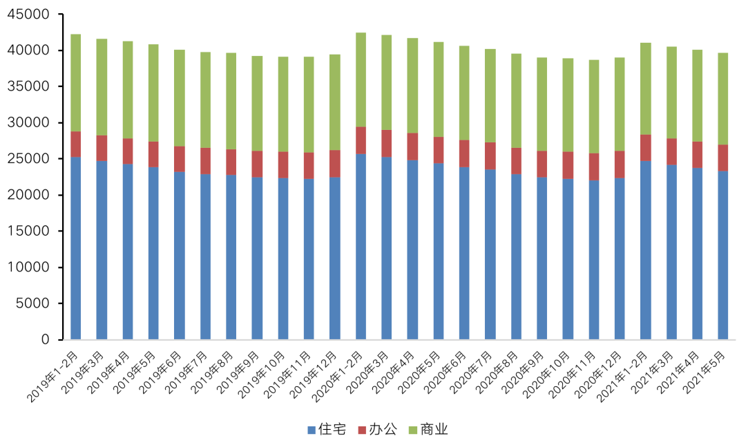具體而言,得益于市場成交火熱,供不應求帶動整體庫存回落,住宅待售面積降幅顯著,較4月減少399萬平方米,辦公、商業待售面積降幅有限,5月較4月下降均不超20萬平方米,整體去化壓力依舊較大。