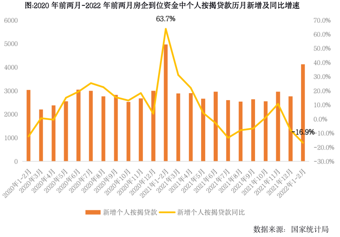 房地產開發企業各項到位資金中,個人按揭貸款同比跌幅進一步擴大。2021年12月,新增個人按揭貸款2755億元,同比轉跌8%。2022年1-2月,新增個人按揭貸款4124億元,同比下降16.9%,同比跌幅較2021年末擴大8.9個百分點。