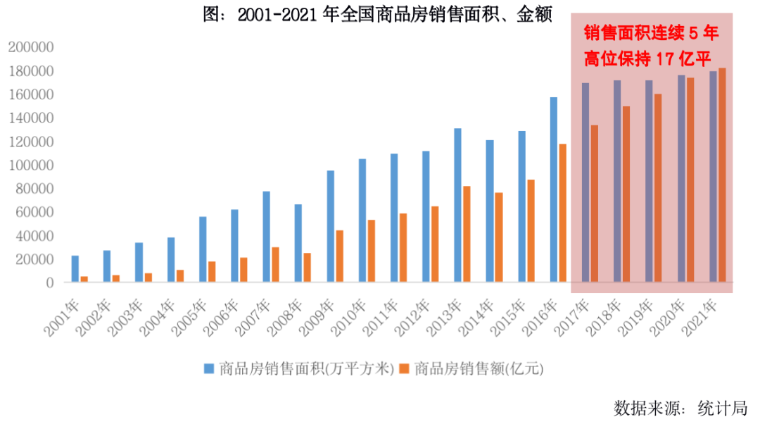 第五,住房需求趨于飽和,商品房銷售面積連續5年高位保持17億平方米。2017-2021年,全國商品房銷售面積連續5年高位保持在17億平方米。2021年,全國商品房銷售面積17.9億平方米,同比僅增長1.9%。與此同時,全國城鎮居民人均居住面積達到40平方米以上,真實反映行業規模基本見頂,未來成交規模或將步入下降通道。