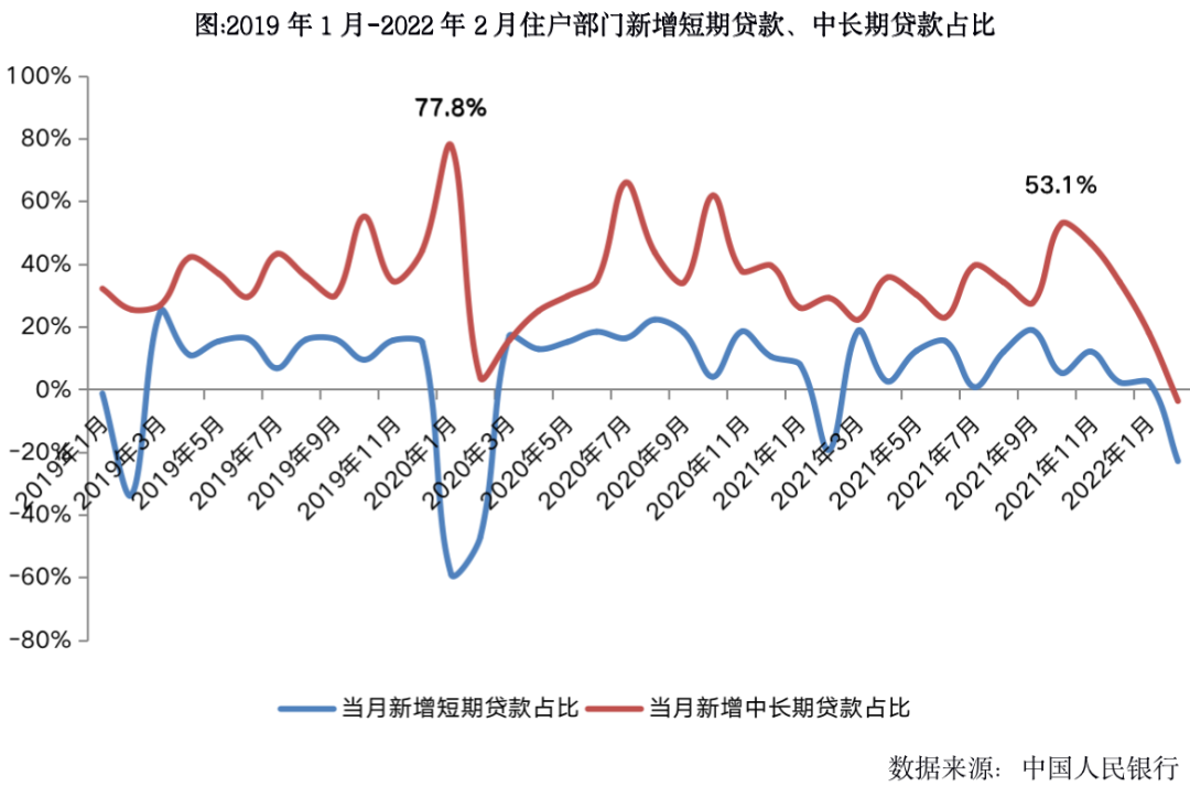 不過,居民實際按揭貸款顯著不及市場預期。2021年10月,住戶部門中長期貸款占比一度升至53.1%的高位,但隨后歷月占比持續走低。2022年2月,住戶部門短期貸款減少2911億元,中長期貸款減少459億元,住戶中長期貸款歷史首次出現負增長。