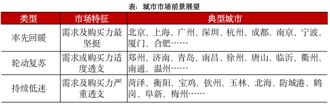 因此,我們認為隨著市場信心逐步恢復,北京、上海、杭州等核心一二線城市市場有望率先轉暖,鄭州、濟南、徐州等弱二線及強三線城市市場或將輪動復蘇。基于市場需求及購買力嚴重透支,菏澤、北海、寶雞等弱三四線城市市場或將持續低迷。