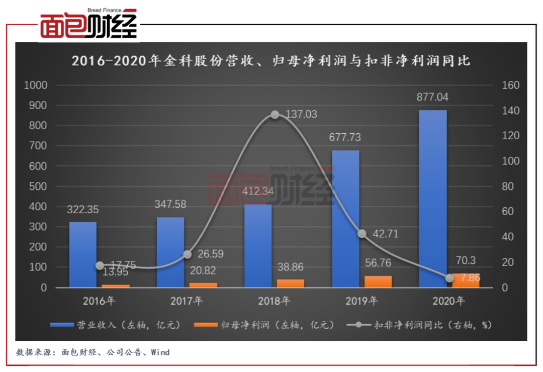 據金科股份2020年年報,報告期內公司實現營收、歸母凈利潤分別為877.04億元和70.3億元,均保持兩位數增長。
