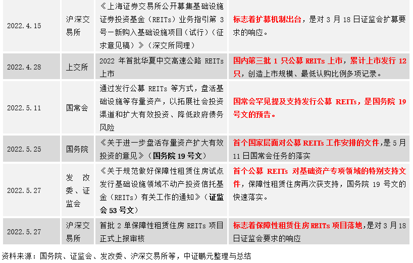 2022年3月18日,證監(jiān)會(huì)發(fā)布《深入推進(jìn)公募REITs試點(diǎn),進(jìn)一步促進(jìn)投融資良性循環(huán)》,研究出臺(tái)擴(kuò)募機(jī)制和推進(jìn)保障性租賃住房REITs項(xiàng)目試點(diǎn)。隨后,交易所發(fā)布擴(kuò)募機(jī)制征求意見(jiàn)稿,證監(jiān)會(huì)53號(hào)文落地,專項(xiàng)支持發(fā)展保障性租賃住房REITs,同時(shí)兩單項(xiàng)目正式上報(bào)交易。