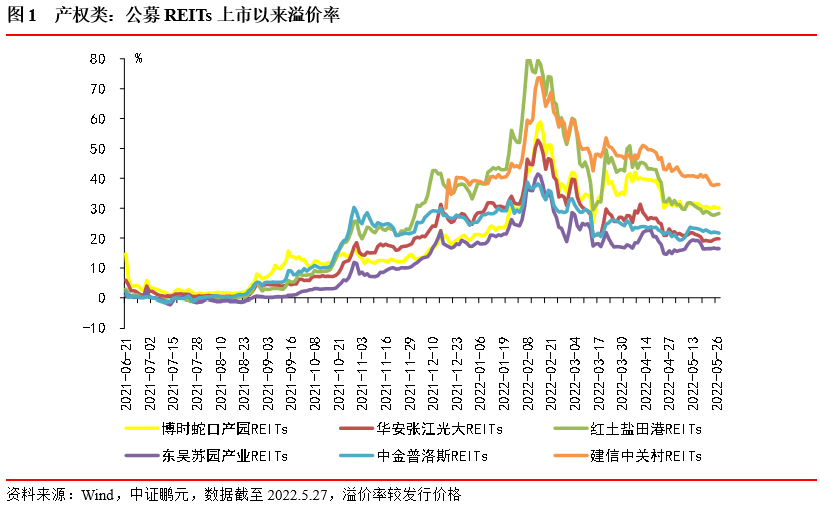 截至2022年5月27日,我國(guó)基礎(chǔ)設(shè)施公募REITs共發(fā)行12只,發(fā)行規(guī)模為458.12億元,總市值為517.87億元,全市場(chǎng)平均溢價(jià)率為13.04%,產(chǎn)權(quán)類(6只)平均溢價(jià)率為24.79%,特許經(jīng)營(yíng)權(quán)類(6只)平均溢價(jià)率為5.70%。二級(jí)市場(chǎng)收益率(未考慮分紅)表現(xiàn)最好的是富國(guó)首創(chuàng)水務(wù)REITs、建信中關(guān)村REITs和博時(shí)蛇口產(chǎn)業(yè)園REITs,溢價(jià)率分別為42.14%、37.91%、30.00%,平安廣州交投廣河高速公路REITs溢價(jià)率為-4.32%,唯一一只二級(jí)市場(chǎng)收益率為負(fù)的產(chǎn)品。作為今年目前唯一上市的中交高速公路REITs,創(chuàng)下最低認(rèn)購(gòu)比例,但二級(jí)市場(chǎng)表現(xiàn)不符合預(yù)期,目前溢價(jià)率僅為0.87%,上市首日溢價(jià)率為2.20%,上市以來(lái)最高溢價(jià)率僅為4.16%,最低溢價(jià)率為0.85%。基礎(chǔ)資產(chǎn)類型較為集中,其中產(chǎn)業(yè)園區(qū)REITs有4只、高速公路REITs有4只、倉(cāng)儲(chǔ)物流和污染處理REITs均為2只。主要原始權(quán)益人中有2家央企,9家地方國(guó)企,1家外商獨(dú)資企業(yè)。目前正在申報(bào)審核的REITs有6只,新增1單發(fā)電和2單保障性租賃住房項(xiàng)目類型。