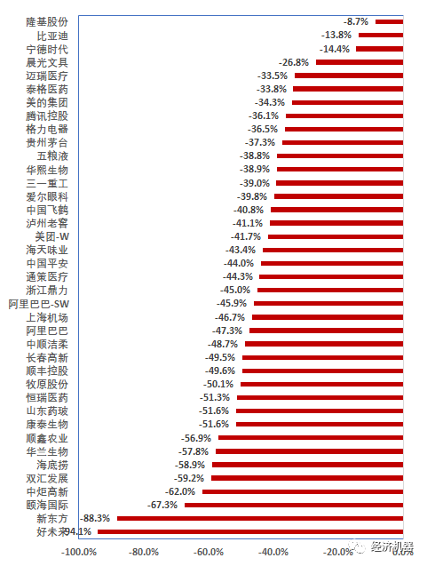 4)部分核心資產“業績暴雷”,或者邏輯出現松動,一般會出現經典的“戴維斯雙殺”。半年報顯示,大批核心資產股票業績出現暴雷,數量之多,幅度之大,歷史上也是不多見的。一些大牛股,比如海天味業、恒瑞醫藥等過去十年,從來未出現過當季凈利潤同比出現負增長,但今年都出現了(圖8)。這里面有行業新政的因素(比如帶量采購),有高基數的因素,也有整體環境因素。不管怎么說,一旦業績出現暴雷,處于估值高位的核心資產,必會出現經典的“戴維斯雙殺”,經歷“股價下跌-PE下降-盈利下跌-PE上升-股價進一步下跌-PE回落”等幾個階段。目前來看,部分暴雷核心資產估值仍然虛高,仍有進一步殺估值的空間。