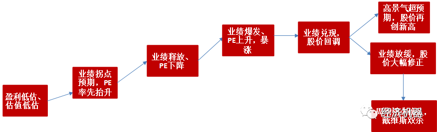 一般來說,周期底部,盈利低點,PE/PB估值處于極低水平(對周期股而言,也可能高PE/低PB)。此時,一旦自下而上出現業績拐點信號,PE/PB估值會率先上升;而后,業績釋放,PE出現大幅下降。如果業績進一步爆發,盈利增速顯著高于趨勢增長水平。就會出現“戴維斯雙擊”,股價暴漲。隨后,如果業績兌現,同時明年業績回到趨勢增長水平,則估值會向合理水平調整,股價出現回落。此后,如果高景氣被證明仍可持續,則股價有望再創新高,估值再次提升;反之,如果業績隨后出現放緩,股價有望大幅修正。一旦周期拐點確認,則會出現猛烈的殺估值現象(圖3),即所謂“戴維斯雙殺”(圖)。當然,周期波動并非是圍繞不變中樞的簡單輪回,更可能是波動中樞緩慢抬升。