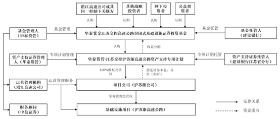 本基金通過基礎(chǔ)設(shè)施資產(chǎn)支持證券與項目公司特殊目的載體穿透取得基礎(chǔ)設(shè)施項目的所有權(quán)。本基金的基金管理人和資產(chǎn)支持證券管理人為華泰證券(上海)資產(chǎn)管理有限公司,本基金的托管人為中國建設(shè)銀行股份有限公司。基金管理人聘請江蘇沿江高速公路有限公司擔(dān)任運營管理機構(gòu),負(fù)責(zé)基礎(chǔ)設(shè)施項目的運營管理工作。上述基礎(chǔ)設(shè)施基金的整體架構(gòu)符合《公開募集基礎(chǔ)設(shè)施證券投資基金指引(試行)》的規(guī)定。本基金的整體架構(gòu)如下圖所示:
