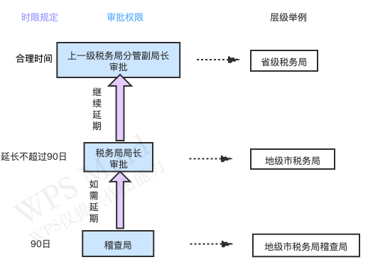 “稽查局應(yīng)當自立案之日起90日內(nèi)作出行政處理、處罰決定或者無稅收違法行為結(jié)論。案情復(fù)雜需要延期的,經(jīng)稅務(wù)局局長批準,可以延長不超過90日;特殊情況或者發(fā)生不可抗力需要繼續(xù)延期的,應(yīng)當經(jīng)上一級稅務(wù)局分管副局長批準,并確定合理的延長期限。”