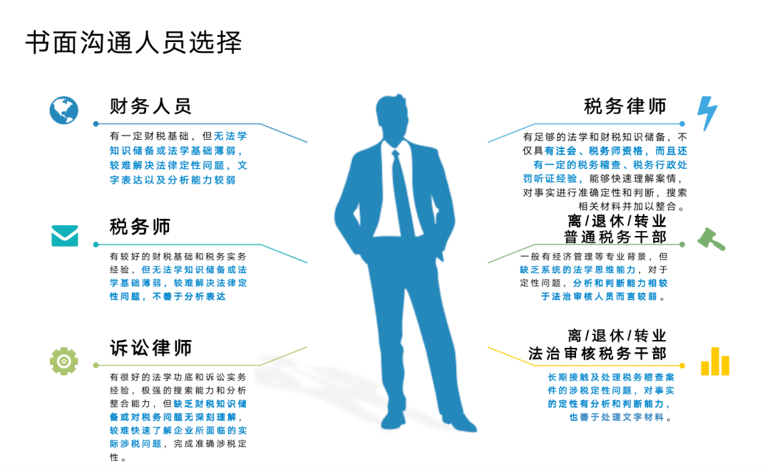 從上圖對比可看出,擁有注冊會計師、稅務(wù)師資格且有一定稅務(wù)稽查應(yīng)對、稅務(wù)行政處罰聽證經(jīng)驗的稅務(wù)律師和長期在法治審核崗工作的離/退休/轉(zhuǎn)業(yè)稅務(wù)干部會是書面溝通的最佳人選,他們通常具備上述四項能力,能較好地處理事實到定性轉(zhuǎn)化的過程。