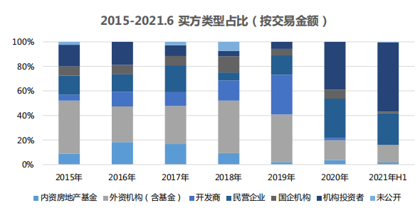 而內(nèi)資基金在2016~2017年表現(xiàn)搶眼,但在2019年后部分機(jī)構(gòu)逐步退出市場(chǎng)。2020年,國(guó)企及金融機(jī)構(gòu)(銀行、保險(xiǎn)等)購(gòu)置成交量明顯上升。2021年上半年投資型買家活躍。
