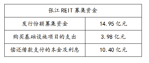 以張江REIT為例,光大安石作為雙權(quán)益人之一,在資金投向上,一是購(gòu)買光全投資持有的安恬投資100%股權(quán),預(yù)計(jì)支付金額約為3.98億元;二是分別向安恬投資及中京電子發(fā)放借款,償還存量負(fù)債及其他用途,合計(jì)約為10.4億元。
