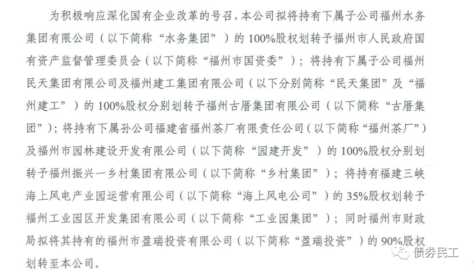 3、根據福州國有資本投資運營集團有限公司(主體信用等級AA+)2022年2月9日的公告,擬將持有下屬4家下屬子公司股權劃出,同時福州市財政局擬將其持有的福州市盈瑞投資有限公司的90%股權劃轉至公司。