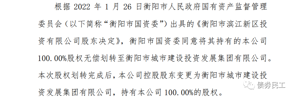 4、根據衡陽市濱江新區投資有限公司(主體信用等級AA)2022年1月28日的公告,衡陽市國資委同意將其持有的公司100.00%股權無償劃轉至衡陽市城市建設投資發展集團有限公司。衡陽市城市建設投資發展集團有限公司(主體信用等級AA+)存量債券金額為333億元,存量債券28只。