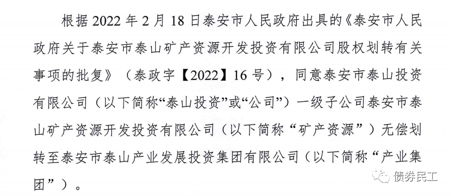 1、根據泰安市泰山投資有限公司(主體信用等級AA+)2022年2月21日的公告,將子公司泰安市泰山礦產資源開發投資有限公司無償劃轉至泰安市泰山產業發展投資集團有限公司。泰安市泰山產業發展投資集團有限公司未發行過債券。