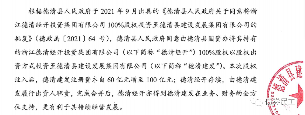 2、根據德清縣建設發展集團有限公司(主體信用等級AA+)2022年2月10日的公告,德清縣國資辦將其持有的浙江德清經開投資集團有限公司100%股權以股權出資方式投資至公司。浙江德清經開投資集團有限公司主體信用等級AA,債券存量金額為12.98億元。