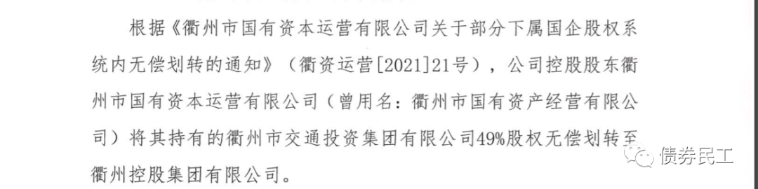 8、根據衢州市交通投資集團有限公司(主體信用等級AA+)2022年1月17的公告,公司控股股東衢州市國有資本運營有限公司將其持有的公司49%股權無償劃轉至衢州控股集團有限公司。衢州市國有資本運營有限公司(主體信用等級AA+),存量債券金額為106.50億元。