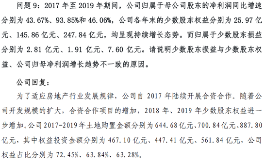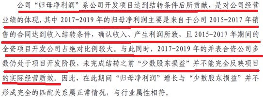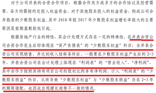 不可以。很多賣方的報告是存在錯誤的。應該說明股實債會導致權益比和損益比之間存在差異,但并不能說這兩個指標之間存在差異就是因為明股實債,因為導致這兩個指標產生差異的原因有很多,并且最核心的因素也不是明股實債。比如我們在文首指出的地產公司由于預收制度的存在導致收入確認和利潤分配存在滯后。也就是說,這兩年合作開發比較多,那么非并表全資子公司的投入在當期就計入了少數股東權益,但是這些項目要達到收入確認條件至少是2-3年之后的事情,因此這就會造成權益比和損益比之間出現差異。也就是說,小股東雖然現在出資了,但是分配利潤要等到2-3年之后,這就會使得當期的少數股東損益占比小于少數股東權益占比。結合現實情況可知,合作開發也就是17年逐步開始出現的,也就是說,17年合作的項目,當年小股東的投入已經計入了少數股東權益,但是這些項目要達到結轉條件基本要到2020年,所以在利潤表上是這幾年都不會有分配,這個原因是造成這幾年二者之間差異的最重要原因。此外,還有其他因素會導致這一差異,比如不同項目之間盈利情況是存在差異的,比如有的小股東在達到收入確認條件前會提前退出等等。