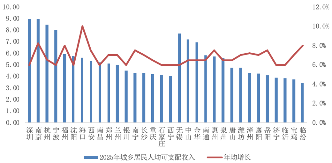 2025年,福州、沈陽、海口等二線城市城鄉居民人均可支配收入將接近6萬元,杭州、寧波則將突破8萬元,深圳、南京更將升至9萬元,年均分別增長6%和8.2%。南通、惠州等三四線城市城鄉居民人均可支配收入同樣將接近6萬元,無錫、中山則將突破7萬元,年均分別增長6%和6.5%。