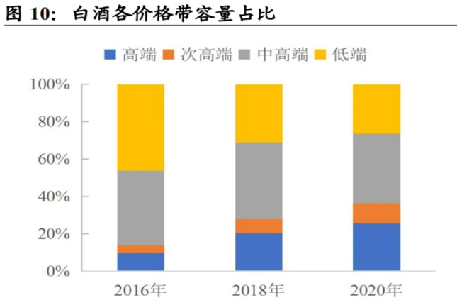 而在本輪行業(yè)復(fù)蘇周期中,除了高端酒拉動行情,次高端白酒也表現(xiàn)搶眼。據(jù)東北證券研究顯示,次高端白酒的市場規(guī)模在2016年—2020年的四年間,從250億上升至662億,增長幅度為165%,超過高端白酒150%的增幅。市場占有率也從4.13%增長至10.66%。