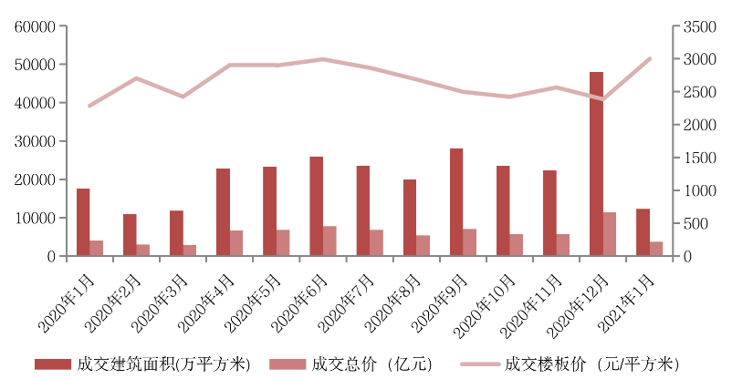 2021年開年首月,土地市場成交量跌價漲,但房企整體拿地仍然處于低位,銷售50強房企單月拿地金額同比下降4%,與去年一季度月均投資額相當。