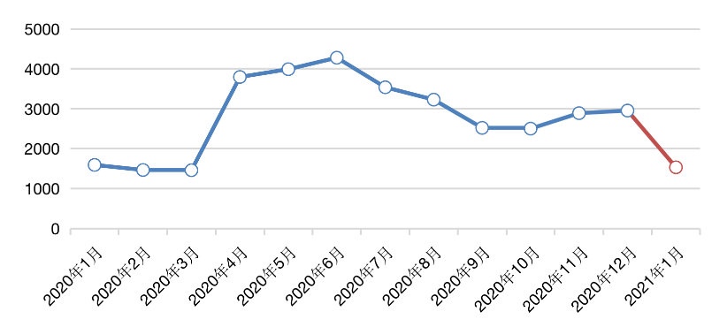 圖:銷售50強房企2020年1月至2021年1月單月拿地金額走勢(單位:億元)